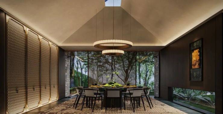 园林设计以杭州法云安缦为蓝本,师法自然、禅意幽远。悉心挑选 40 种热带特色植被,葱郁繁茂、四季繁花。更珍视原地块 4 棵百年古树,以此为核心景观节点,古木参天、岁月沉淀,与新植交相辉映,构筑宁静深邃、自然野趣的园林画卷,让每一步归家皆为穿越诗意秘境的悠然旅程。