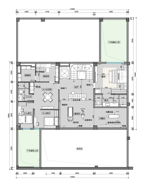 负一层下沉庭院周边环绕健身区、工人生活区与丰富储物空间;
