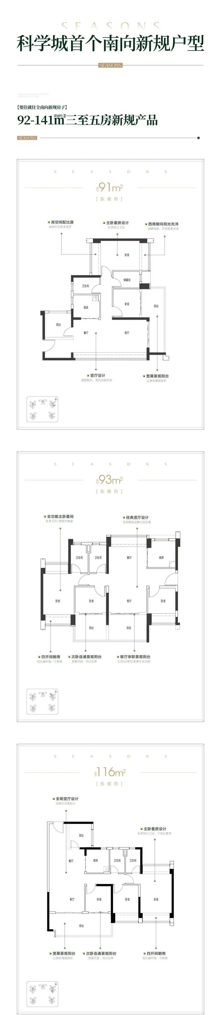 项目主推91-141㎡三至五房,全南向设计,主打高使用率,使用率最高能达到118%,141平户型能直接做到5房,而且是双主套设计。