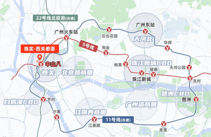 作为羊城千年商都的根基,老西关早已发展成熟,生活配套应有尽有,区域优势明显。在交通方面,珠实西关都荟近享高效出行;(直线距离约)500米即是地铁5/11号线中山八站,11号线预计2024年年底开通,未来直达白鹅潭、琶洲、珠江新城、金融城等CBD。