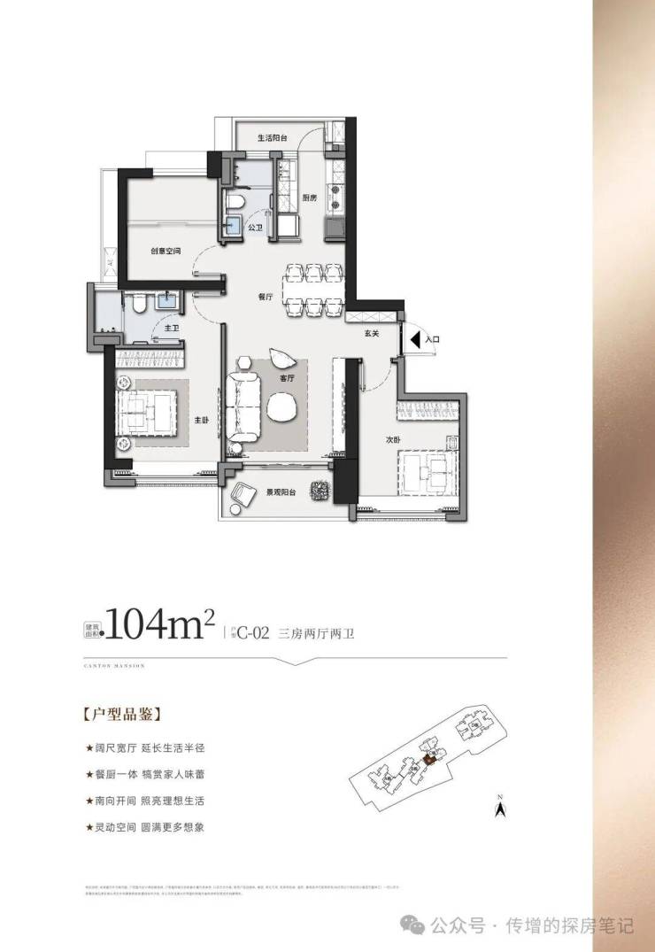 建面约104㎡三房两厅两卫南向3房设计,生活一步到位,南北双阳台设计,延展生活空间,阔绰会客空间,盛载欢声笑语