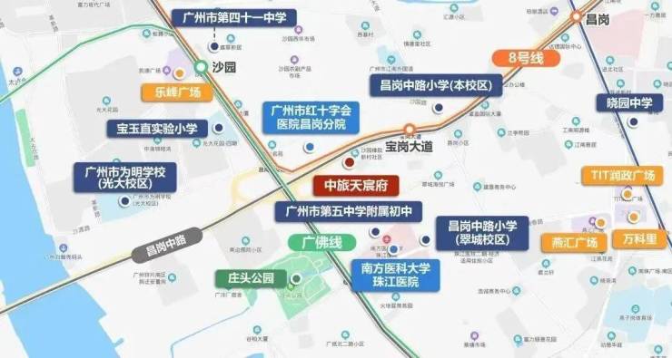 项目位于海珠区最强教育板块之一,根据海珠区教育局公布《2024年海珠区公办小学招生服务地段表》:中旅天宸府所属沙园街橡胶新村社区,约500米直距昌岗中路小学,符合就近入读条件。