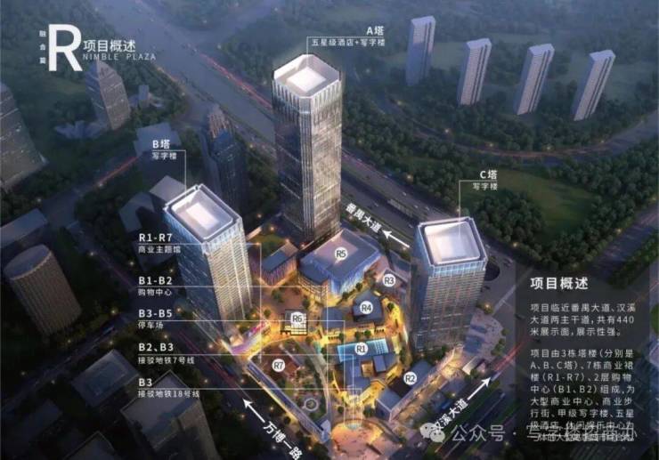 项目规划:3栋塔楼(A塔47层,B塔37层,C塔31层),7栋商业独栋裙楼,2层地下购物中心