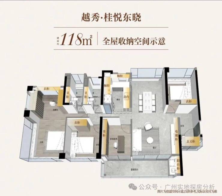 交付标准:采用四层隔音玻璃、防潮防霉材料等,厨房配备猛火炉灶、防干烧系统,柜体采用防霉板材,细节设计贴合广州生活需求。