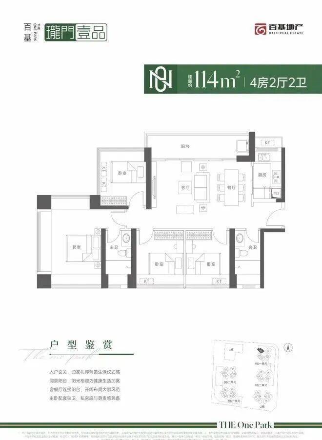 116㎡的4房2厅2卫,设计的是横厅南北通透格局,进门入户玄关,客餐厅6米开间,LDKB一体化设计,五开间朝南,4个卧室分别做到了3.775米/3.2米/2.6米/2.575米的宽度,主卧三面飘窗,6米长的大阳台,L型厨房,卫生间干湿分离,得房率:70.65%(不含赠送),阳台主朝东南向。