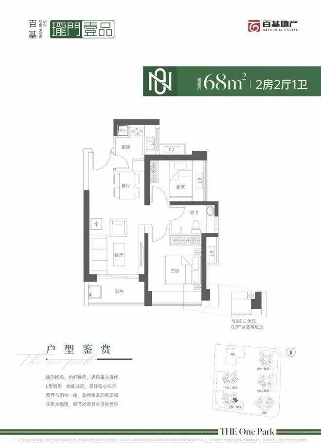 68㎡的2房2厅1卫,仅3栋1单元02户型,设计的是竖厅格局,客厅3.2米开间,LDKB一体化设计,L型厨房,卫生间干湿分离,得房率:71.3%(不含赠送),东南朝向。