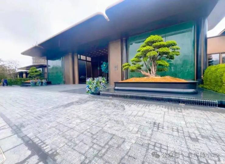 馥香园大门以近9米高、50米宽的奢华尺度打造,再配上如泼墨山水般纹理的印度绿奢石,外加香槟金 色的金属飘檐,大宅气派尽显,就连门口的对树都有讲究,这里用的是百年老桩的米兰,因其神似迎客松,但又有独特的香味,细节经得起考验。