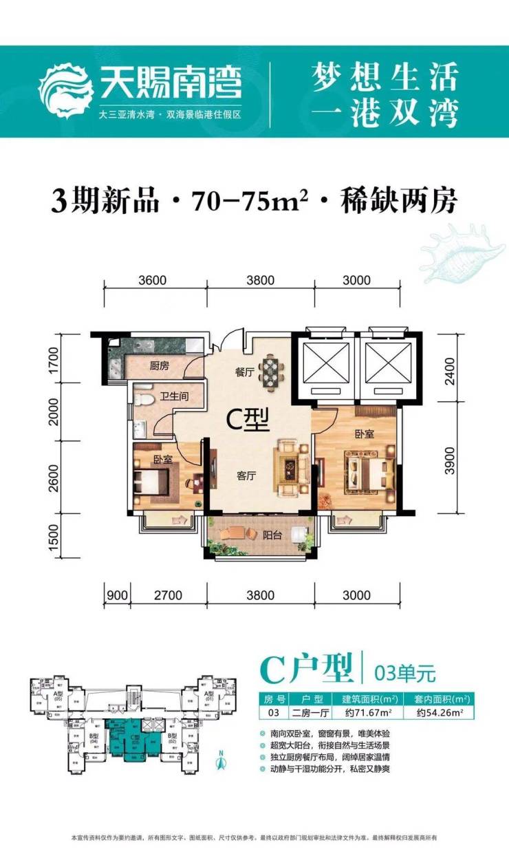 稀缺小户型:清水湾双海景,70年大产权,现房小户型!三期主力户型:约70-75㎡(两房)