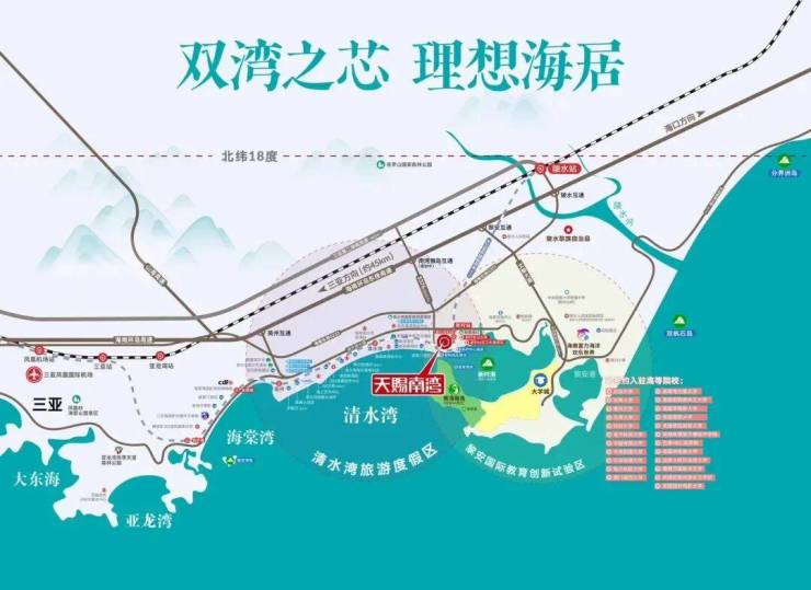 :清水湾,宛如一颗璀璨的明珠,散发着迷人的魅力;黎安国际创新教育试验区,在发展教育的同时,也为这片湾区注入了新的活力;海棠湾,以其高端的度假配套和优美的自然风光,成为了众多游客向往的度假胜地。