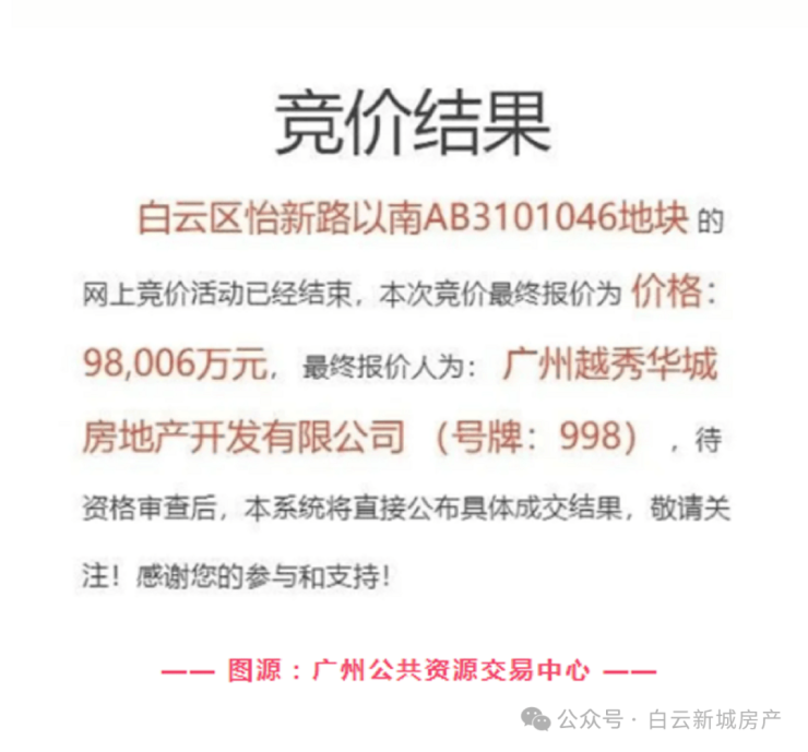 公开资料显示,上述地块白云区怡新路以南AB3101046地块,在今年9月30日经过24轮竞价,由越秀地产以9.8亿拿下,折合楼面价2.99万/m²。