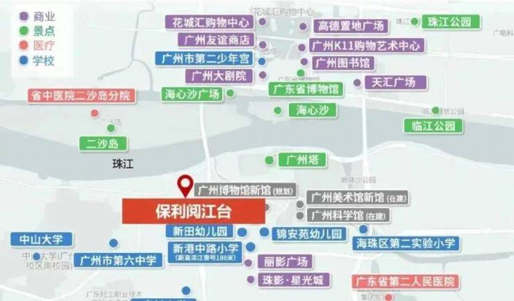 保利·阅江台坐拥珠江新城、二沙岛等高端地标,项目直线距离珠江约354米,距广州塔仅约900米,置身广州繁华市区心脏地带。项目北侧与珠江新城CBD、二沙岛隔桥相望,周围交通便利:广州大道、珠江新城、琶洲西区、海珠等核心区域触手可及。自驾出行只需10分钟即可畅达广州CBD核心区,地铁3号线、8号线和APM线环绕,未来12号线开通后,交通更加便捷。