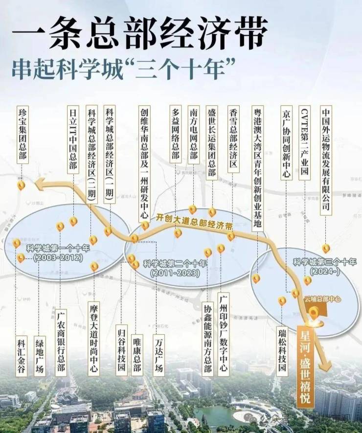 ●开创大道是科学城最光鲜的门面担当,作为“总部经济带”,聚集了南方电网、创维、日立IT等二十多个企业总部,它的重要地位,类似于广州新中轴,串起了科学城的过去、现在和未来!