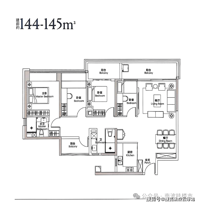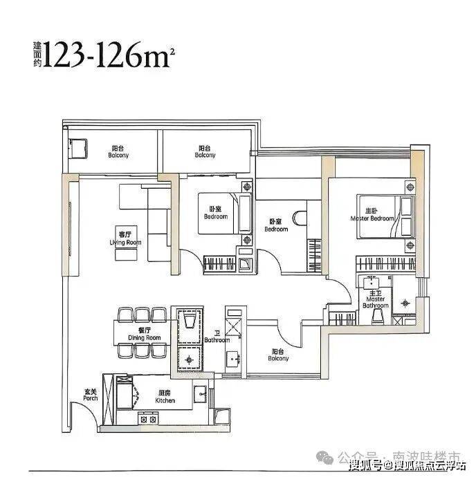 123㎡四房两厅户型,传统中规中矩户型,与122㎡进门口与厨房方位不一致,均采用双阳台设计;