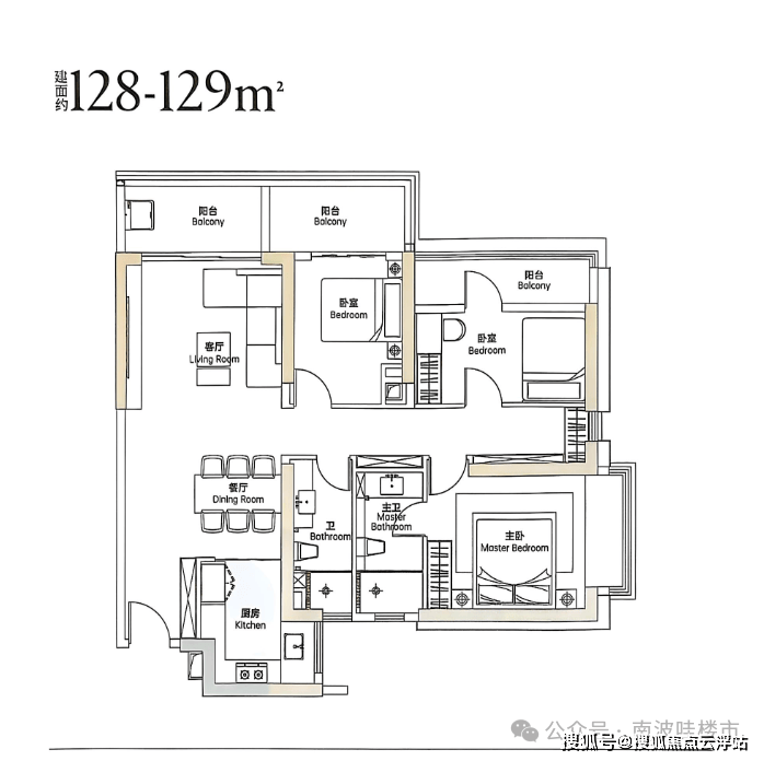 128㎡四房两卫,四个房间对立设计,做到了通风采光对流,厨房相对较小,实际样板房与户型图有差异。