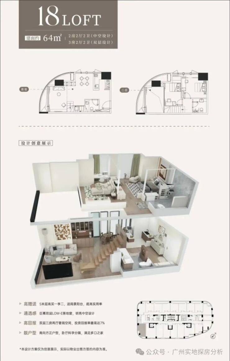约64㎡,可设计为2+1房2厅2卫(中空设计3+1房2厅2卫(双层设计)。
