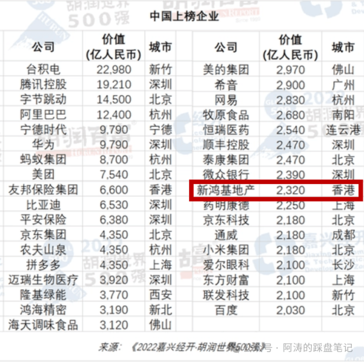 2022年胡润世界500强榜单中,全球仅7家房地产企业上榜,其中中国只有新鸿基地产一家,成为价值最高房企。
