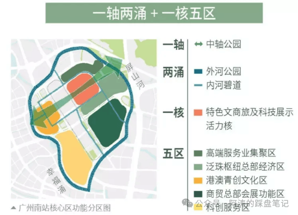 南站核心区总占地面积约4平方公里,相当于4个珠江新城。空间布局分为“一轴两涌+一核五区”。