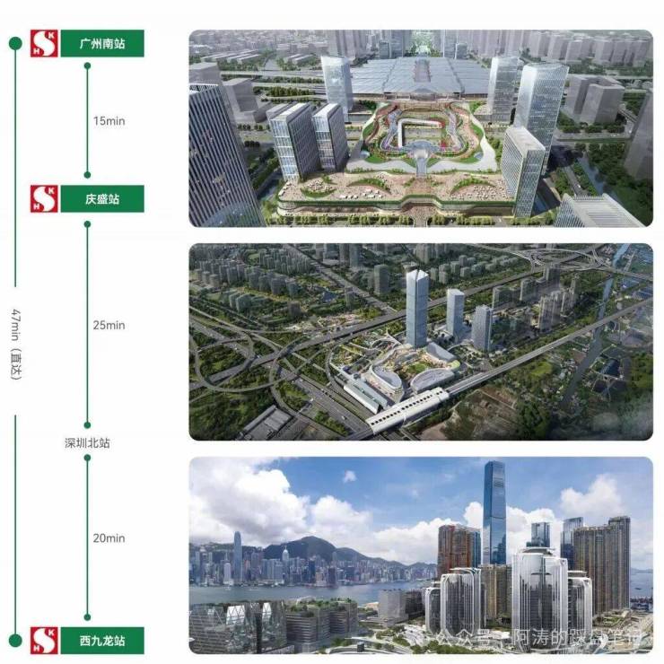 广深港高铁上汇聚新鸿三大TOD地标巨作(南站ICC-庆盛枢纽TOD-西九龙高铁站上盖发展项目),一轨之上港穗互联,比肩世界,总投资额高达近千亿。