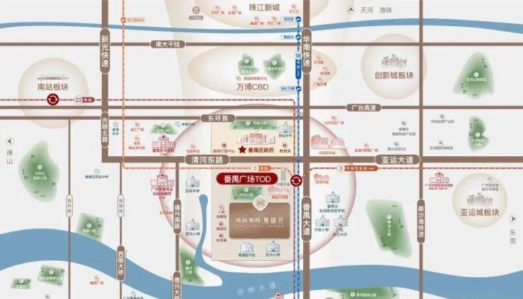 广州惟一双高速地铁区域。项目距离地铁番禺广场站约 900 米距离,囊括3号线、3号线东延段(在建中),已开通的广州地铁 3 号线、18 号线、22 号线,未来规划有广州地铁 17 号线,5 轨汇聚于此,如此便捷的交通路网是其他板块难以比拟。