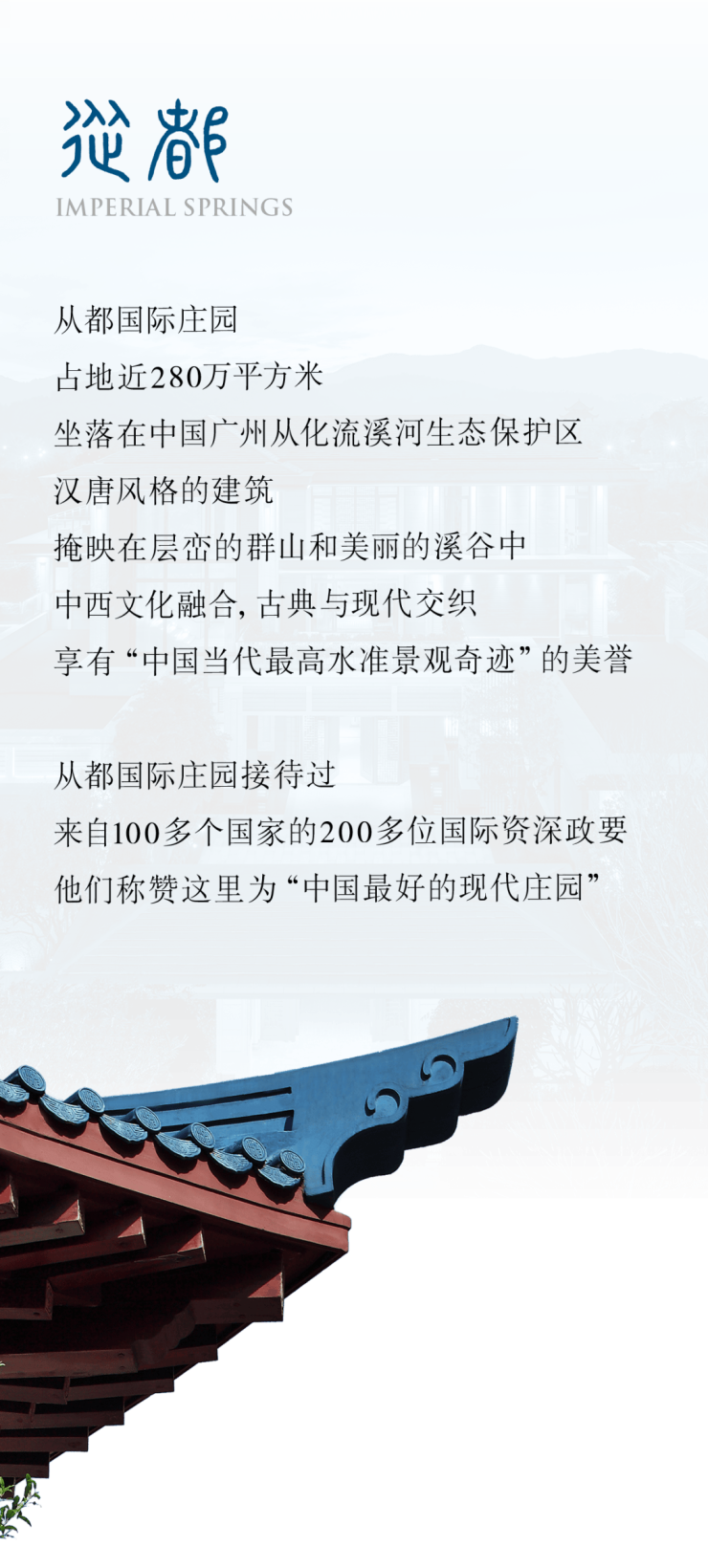从都国际庄园从都国际庄园占地近280万平方米,坐落在中国广州从化流溪河生态保护区。盛唐风格的建筑,掩映在层峦的群山和美丽的溪谷中,享有 “中国当代最高水准景观奇迹”的美誉。
