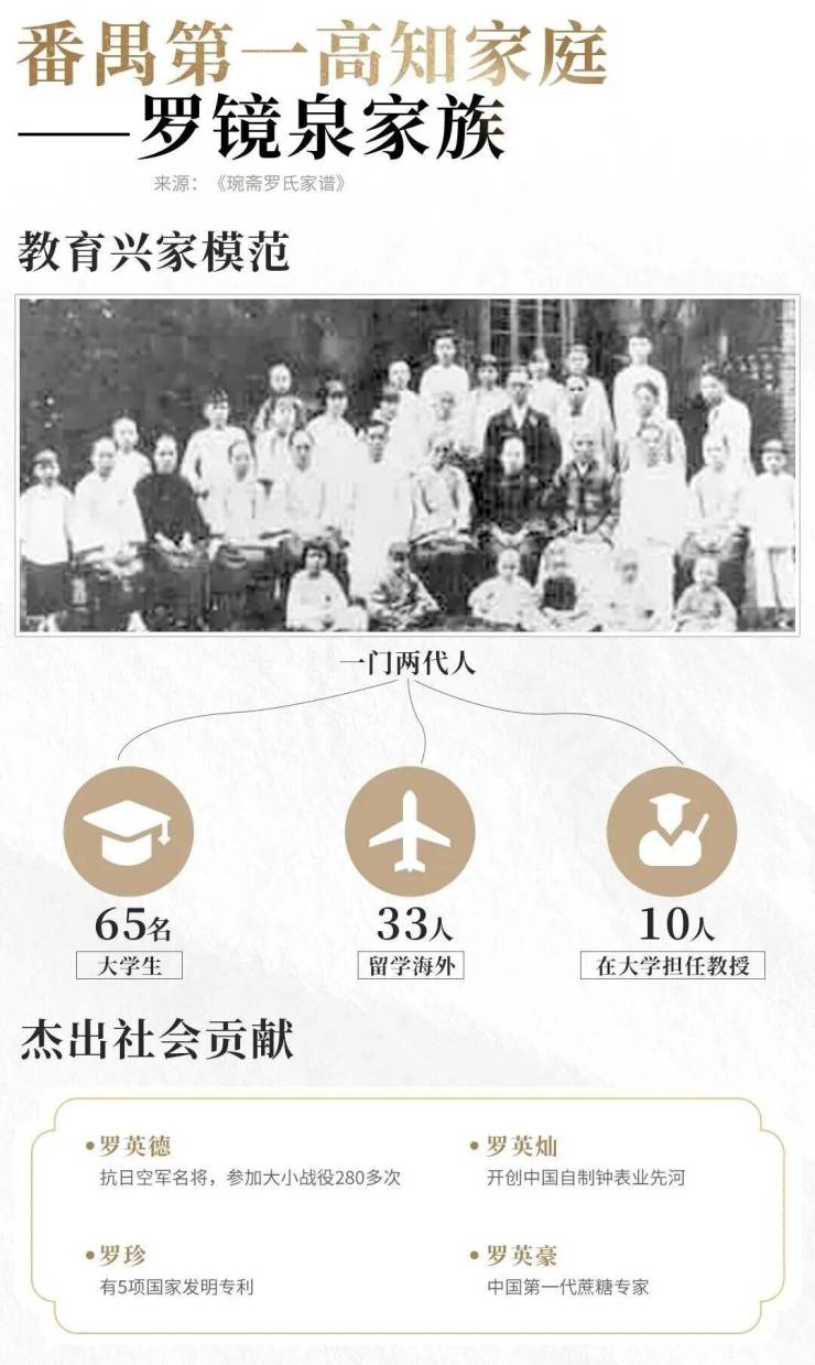 其一门两代人,出了65名大学生,当中有中国第二届公费保送的留学生,有抗日空军名将,有制糖业先驱,有钟表业开创者...时人誉为“番禺第一高知家庭”。