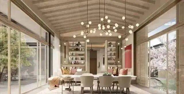 从都庄园温泉别墅还大量运用了玻璃、折叠门等设计方式,实现“无墙化”。450平的户型拥有的独立餐厅折叠门全部打开后,则形成一个中心亭子,仿若置身于花园中用餐。