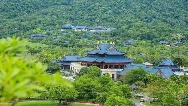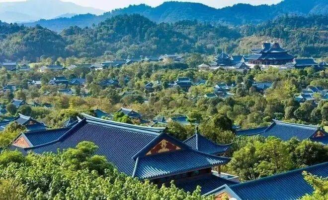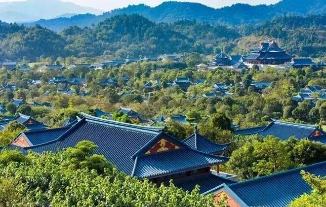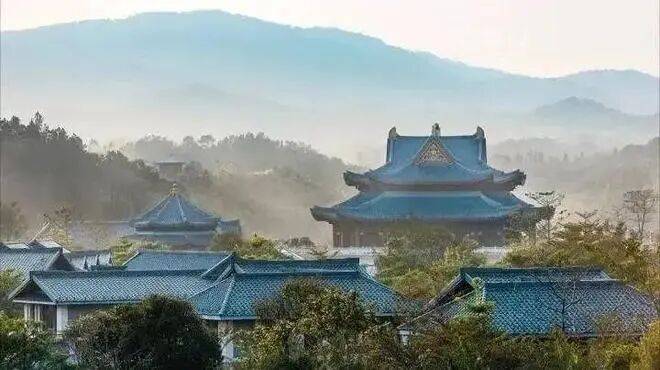 汉唐风格的建筑,掩映在层峦的群山和美丽的溪谷中
