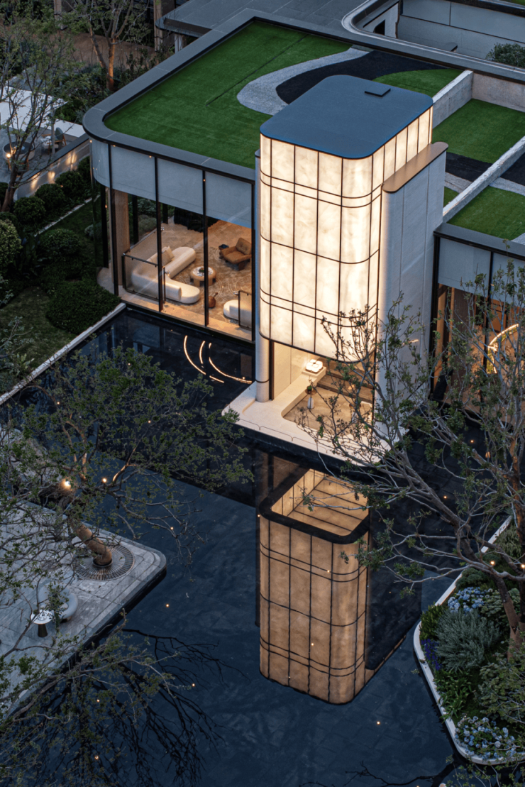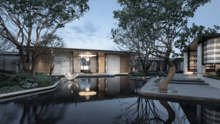 近1000方的水景空间,结合眼前的百年朴树王,让业主们时刻收获空间质感肌理带来的尊崇感。