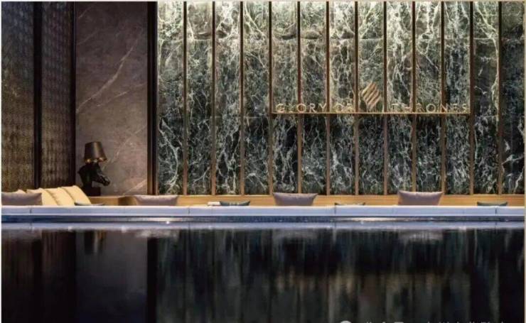 中央水景则是设计师精挑细选近百种名贵石材,整块巴西绿星花岗岩到现场手工切割拼花打造而成。