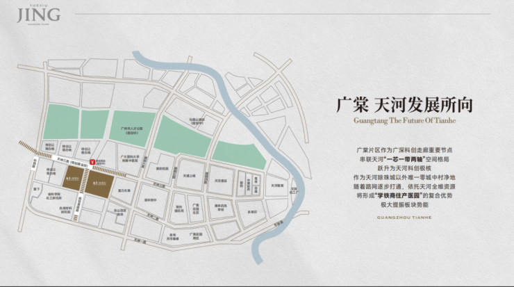 广棠片区目前已由政府统一收储,连片开发,作为天河主城难得的“零城中村”净地,依托天河优质醇熟资源,已形成“学铁商住产医园”的全维板块,作为链接CBD与CTD双核的枢纽区位,完美实现高效通勤与低密栖居的平衡