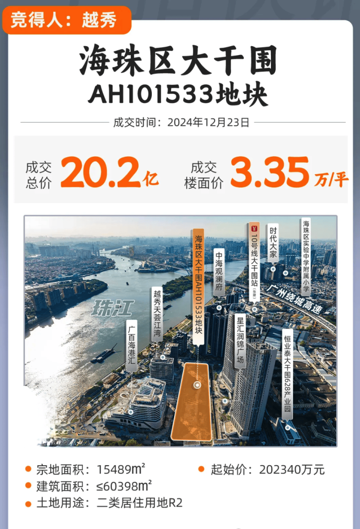 2024年10月18日,大干围AH101533地块正式完成从商业用地到居住用地的规划调整。11月13日,该地块被广州土发中心收储,越秀地产因此获得15.29亿元的现金补偿。随后在11月18日,调整后的地块重新挂牌出让。到了12月23日,地块成功由越秀竞得,成交总价为20.23亿元,楼面价达到33501元/平方米。