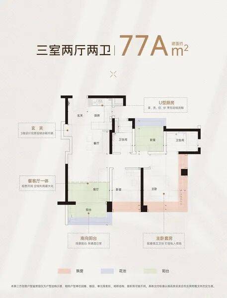77㎡的三房两厅两卫是刚需家庭的热门选择,不仅做到了三面宽南向,还设计了独立玄关,主卧带全景飘窗,两个卫生间的配置避免了日常争抢的尴尬,总价大概在186-199万之间。