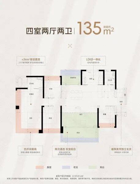 最大的135㎡四房两厅两卫采用南北通透双阳台设计,客厅面宽达5.25米,阳台长约5.45米,主卧还能打造独立衣帽间与书房,空间尺度媲美更大面积的户型,适合多人口家庭长期居住。