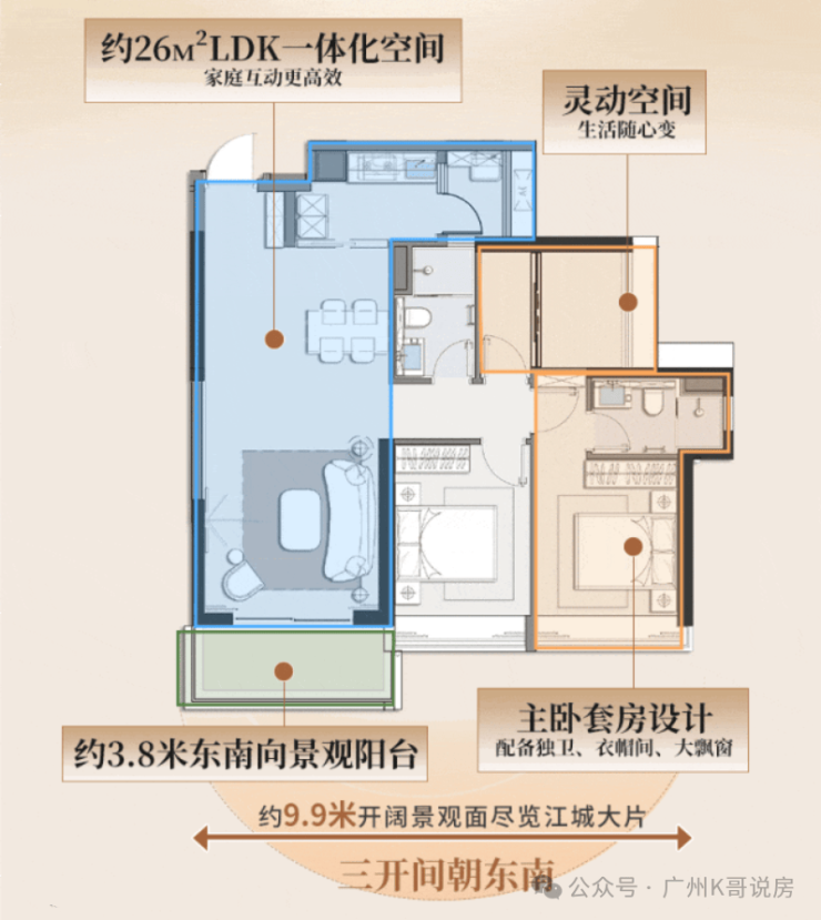 比如,采用少承重墙化设计,次卧可打通或隔开,生活阳台也能与厨房打通出7平全明空间。