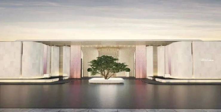 主入口是约55米宽、约8.7米挑高的酒店式大门,再以各种奢石铺陈;