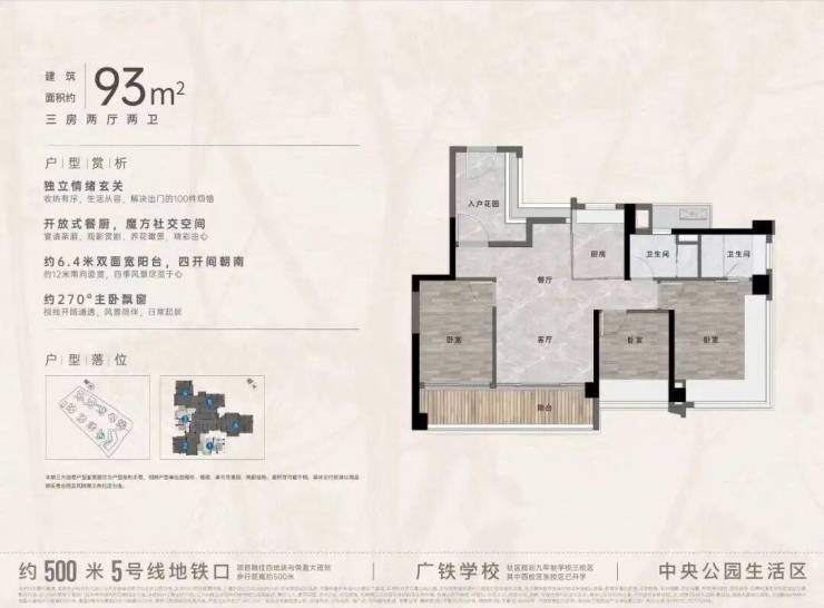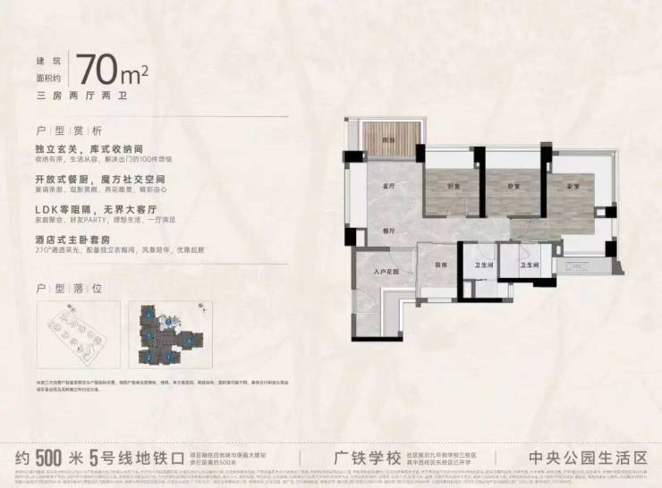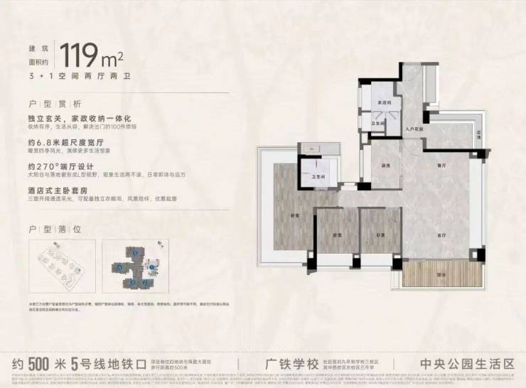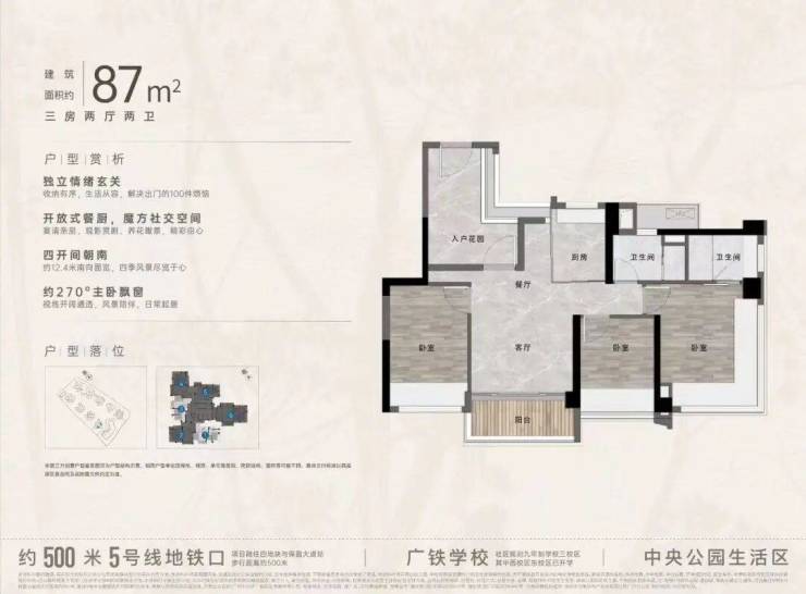 项目加推“中央公园”,紧邻大脚印公园,距离地铁约500米,紧邻学校、酒店,户型涵盖75-88㎡三房,105、125、142㎡四房。