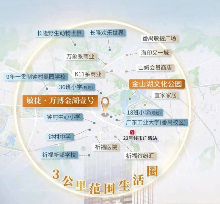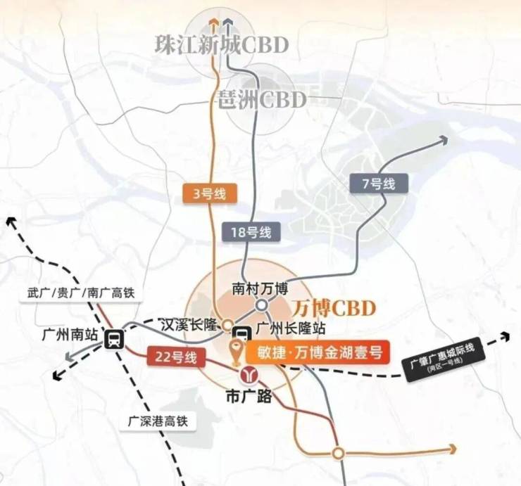项目交通条件:项目距离地铁22号线市广路站约900米,1站番禺广场、2站万博中心,3站琶洲CBD、4站珠江新城。目前22号线只开通了陈头岗到番禺广场的路段,乘坐22号线可一站到广州南,或者1站到番禺广场换乘3/18号线,去珠江新城或者琶洲都很方便。项目旁边规划配建公交首末站,门前约200米敏捷集团公交站,8条公交线路便捷出行。自驾的话,项目出门就是市广路,周边还有广台高速、汉溪大道、新光快速等干线,出行非常方便,从小区开车去万博CBD仅3公里的距离,不堵车的话走福翠路接驳汉溪大道10分钟内即可抵达那边。