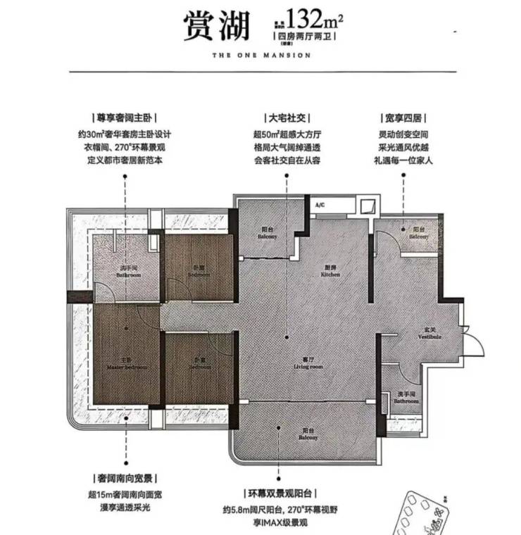 建面132平四房两卫,横厅南北对流设计,超50平的大方厅,约5.8米的景观阳台,主卧面积也有30平,带独立衣帽间。