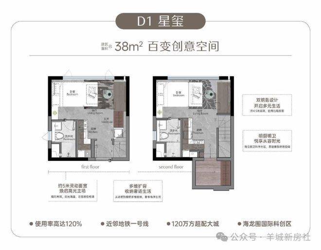 :约5.0-7.1米超宽面宽,搭配4.5米挑高,近1:1开间进深比,实现“小面积大享受”;