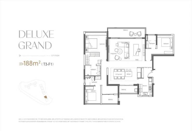 190方户型,四房两厅三卫双套房,T2组合、7米大阳台、9米阔卓厅堂、近55方餐厅,诠释了功能与奢适完美相融