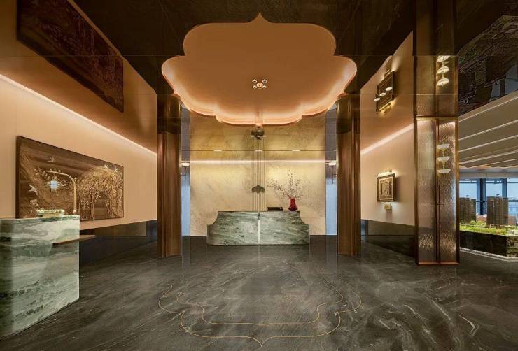 宝格丽酒店式大堂、采用下沉式设计,金色格栅与水刀拼花的典雅地面,营造奢雅质感,仿佛置身上海宝格丽酒店的私享秘境。