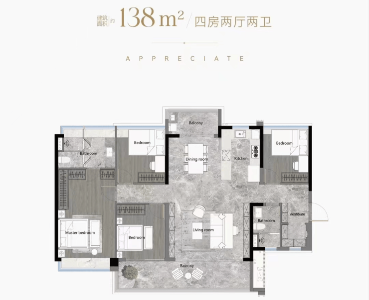 户型鉴赏(103-188平全南向四房,得房率高达126%)