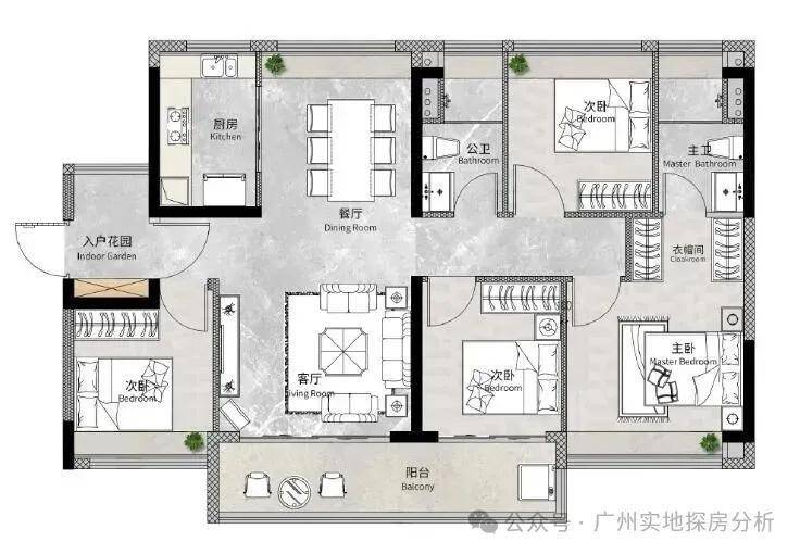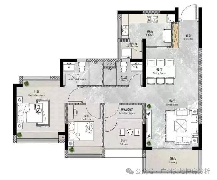 南向户型:主阳台望花都湖及绿轴公园。
