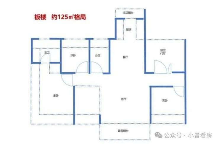 125 平方米四房为 17 层板楼户型,2 梯 2 户保障私密性,南向可俯瞰社区湖景,户型做到动静分区明确,客厅、餐厅联动空间开阔,主卧带独立卫浴和步入式衣帽间,适合对空间和视野有要求的改善型家庭。