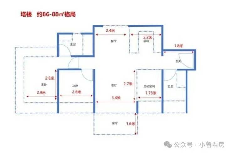 86 平方米三房同样为塔楼 2 梯 5 户配置,做到南北通透,配备 6 米宽景阳台,主卧带飘窗,采光和通风效果突出,空间利用率在同面积段中表现较好。