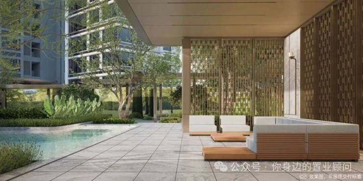 ②仪式感泗水归堂:镜面水庭设计,精选乔木铁冬青(旺宅的寓意)和镜面的水面结合,运用中国东方格局对称美学,借鉴皇家庭院的环抱对称,承载着‘聚水生财’的美好寓意.