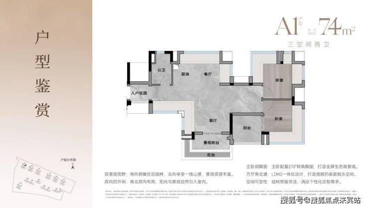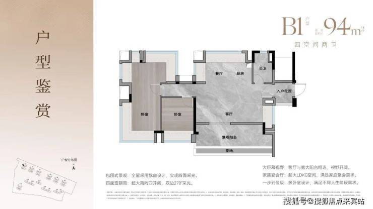 约74-94㎡三至四房,2梯4户设计,四面宽朝南,大方厅设计,小家也有大精彩。