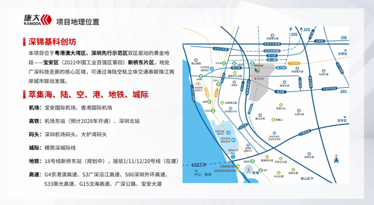 本项目位于粤港澳大湾区、深圳先行示范区双区驱动的黄金地段——宝安区(2022中国工业百强区第四)新桥街道东片区,地处广深科技走廊的核心区域,可通过海陆空轨立体交通串联珠江两岸城市联动发展。