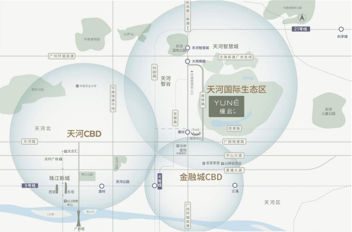 项目紧邻科韵路、广园快速、华南快速等主干道,自驾10-15分钟直达珠江新城、金融城,20分钟覆盖太古汇、天河路商圈。距地铁21号线大观南路站约1公里,可公交接驳,未来周边规划多条轨道交通。形成"自驾为主+地铁为辅"的高效交通网络,适配高净值人群商务通勤与日常出行需求。