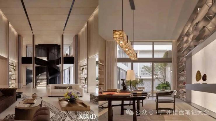细节质感:极简立面用浅香槟金金属板+奢石,大面积落地玻璃让室内外的湖山“无界”;每套墅都有带采光井的地下空间(可做红酒俱乐部/雪茄房),还有星空花园、L型跑道阳台,把“宅中有园”做到极致。